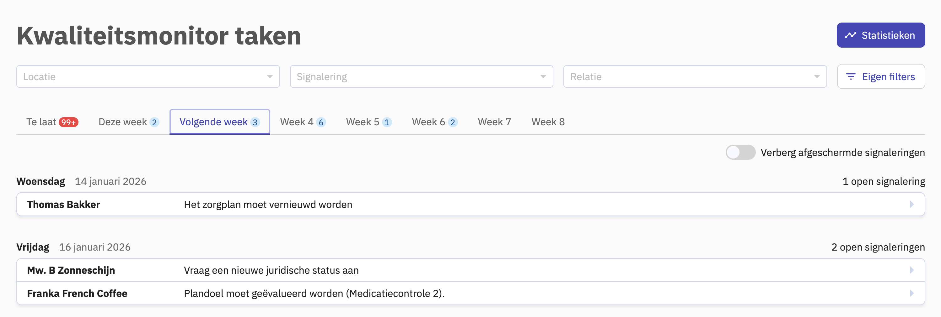 Met de knop Verberg afgeschermde signaleringen kan je taken/signaleringen die niet met jou en jouw deskundigheid zijn gedeeld, verbergen om je te focussen op taken die voor jou relevant zijn.