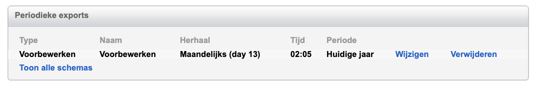 Na het opslaan kun je de periodieke export altijd nog wijzigen of verwijderen, en je kunt ook eenvoudig een nieuwe toevoegen. In het overzicht van de exportprofielen is hiervoor een nieuw blok ‘Periodieke exports’ toegevoegd, waarin je alle ingestelde periodieke exports terugvindt. Het voorbewerken hoeft niet meer langer handmatig te worden ingepland.