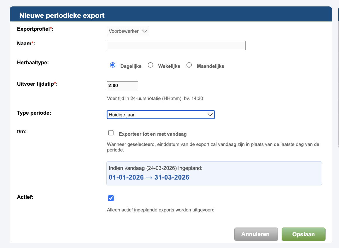 Tijdens het inrichten zie je daarnaast een blauw gemarkeerd blok waarin direct wordt weergegeven welke periode op basis van jouw instellingen wordt geëxporteerd. Deze periode beweegt mee met de keuzes die je maakt, zodat je vooraf precies weet welke gegevens worden meegenomen zodra de export wordt uitgevoerd. Tot slot kun je aangeven of de export actief is. Alleen actieve, ingeplande exports worden daadwerkelijk uitgevoerd.