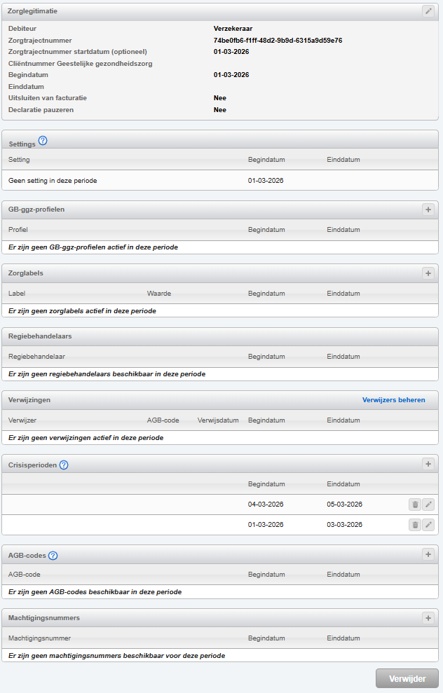 Crisperiodes die in de declaratie context worden gebruikt. Het registreren van een crisisperiode zorgt ervoor dat elke crisisregistratie tijdens die periode wordt gedeclareerd. Let op: je hoeft deze periodes alleen te registreren wanneer je meerdere crisisperiodes in korte tijd hebt; losse periodes hebben hier geen vermelding nodig om declareerbaar te zijn.
