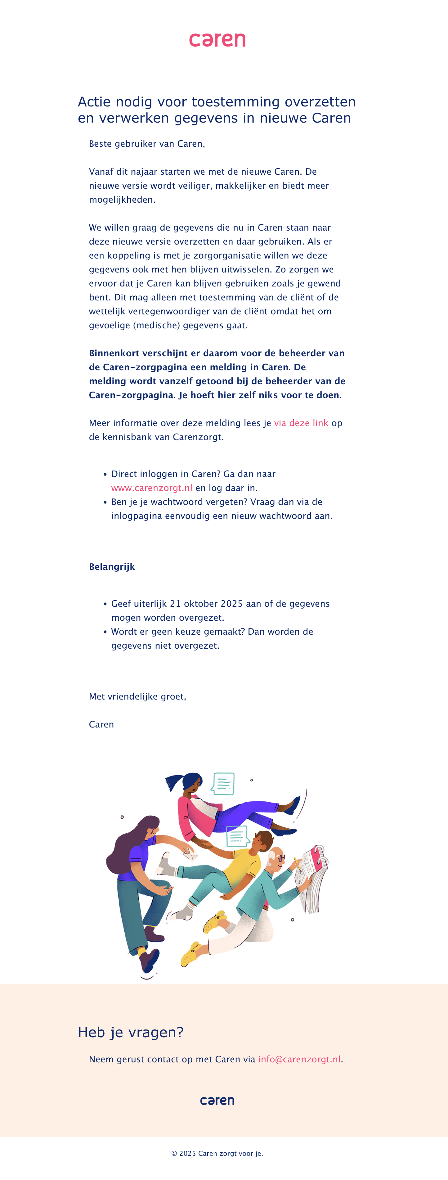 - Een voorbeeld van de e-mail die we op 18 november versturen naar gebruikers van Caren delen we hier binnenkort ook.