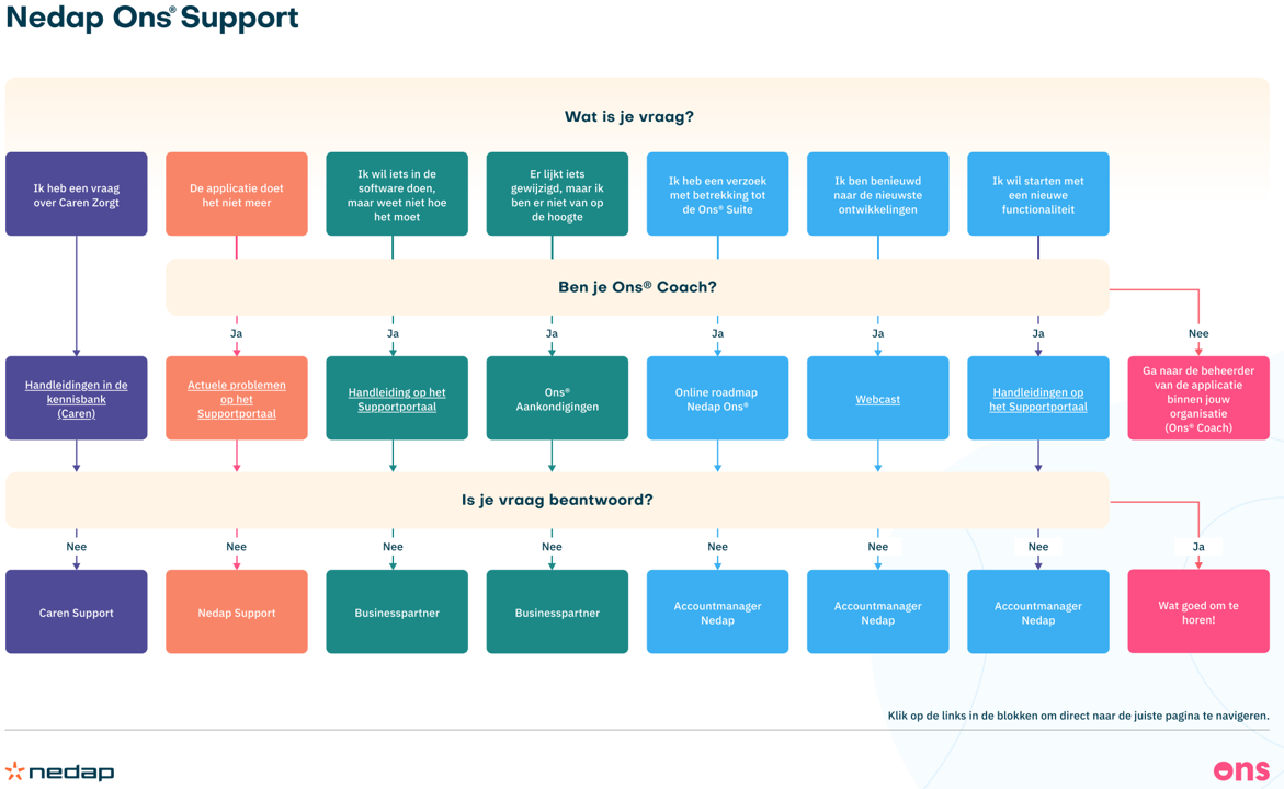 Je bent niet verplicht om alle communicatiekanalen te volgen, maar we verwachten wel dat je als Ons® Coach de aankondigingen in Ons® Aankondigingen en de mails doorneemt. Daarnaast is ook het advies om de verstoringspagina te volgen, zodat je geen (actuele) problemen mist. Je kan zelf beoordelen of jullie organisatie hier ook last van heeft en het verstoringsbericht volgen om updates te ontvangen van ons. Neem onderstaande weergave door om meer inzicht te krijgen in onze informatievoorzieningen. Wil je meer weten over het gebruik van het supportportaal, neem dan deze handleidingen door.